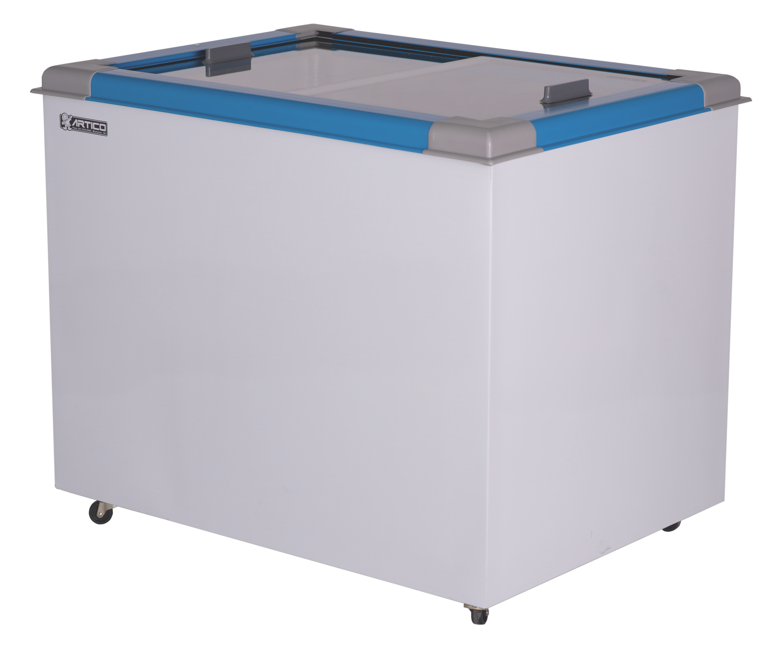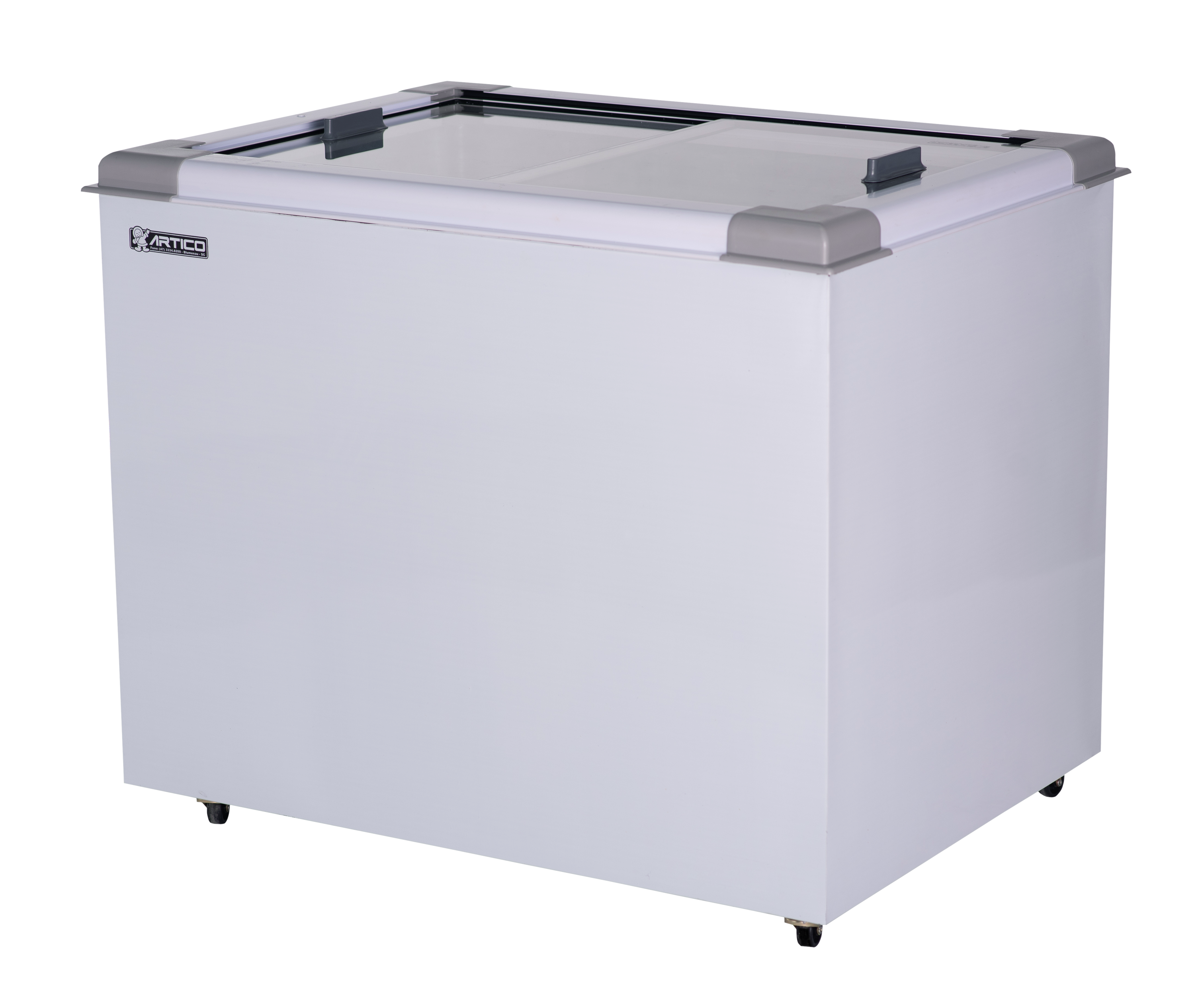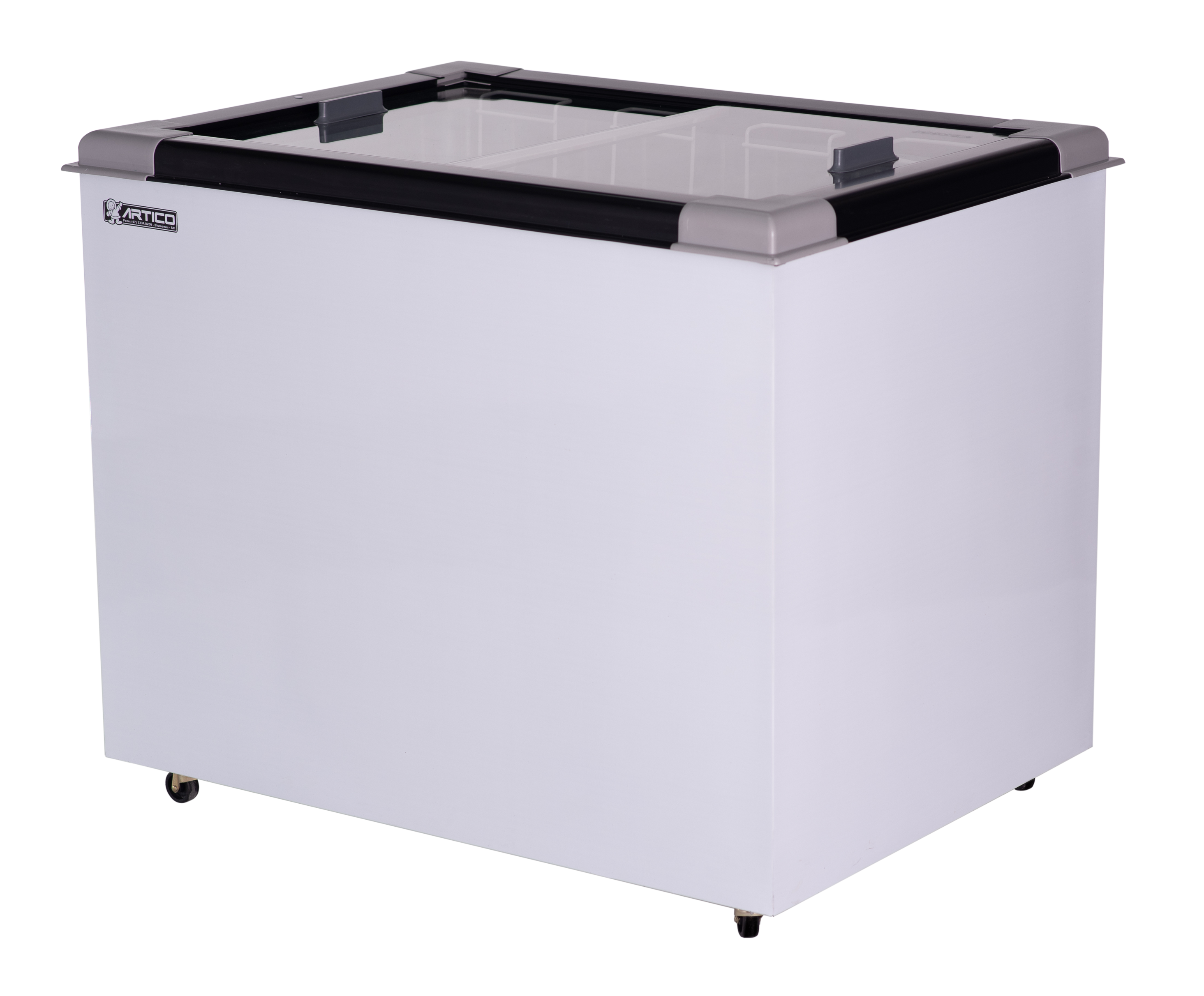 O Congelador expositor Eco 250 é plano. Possui tampas de vidro deslizante e de baixa emissividade.
