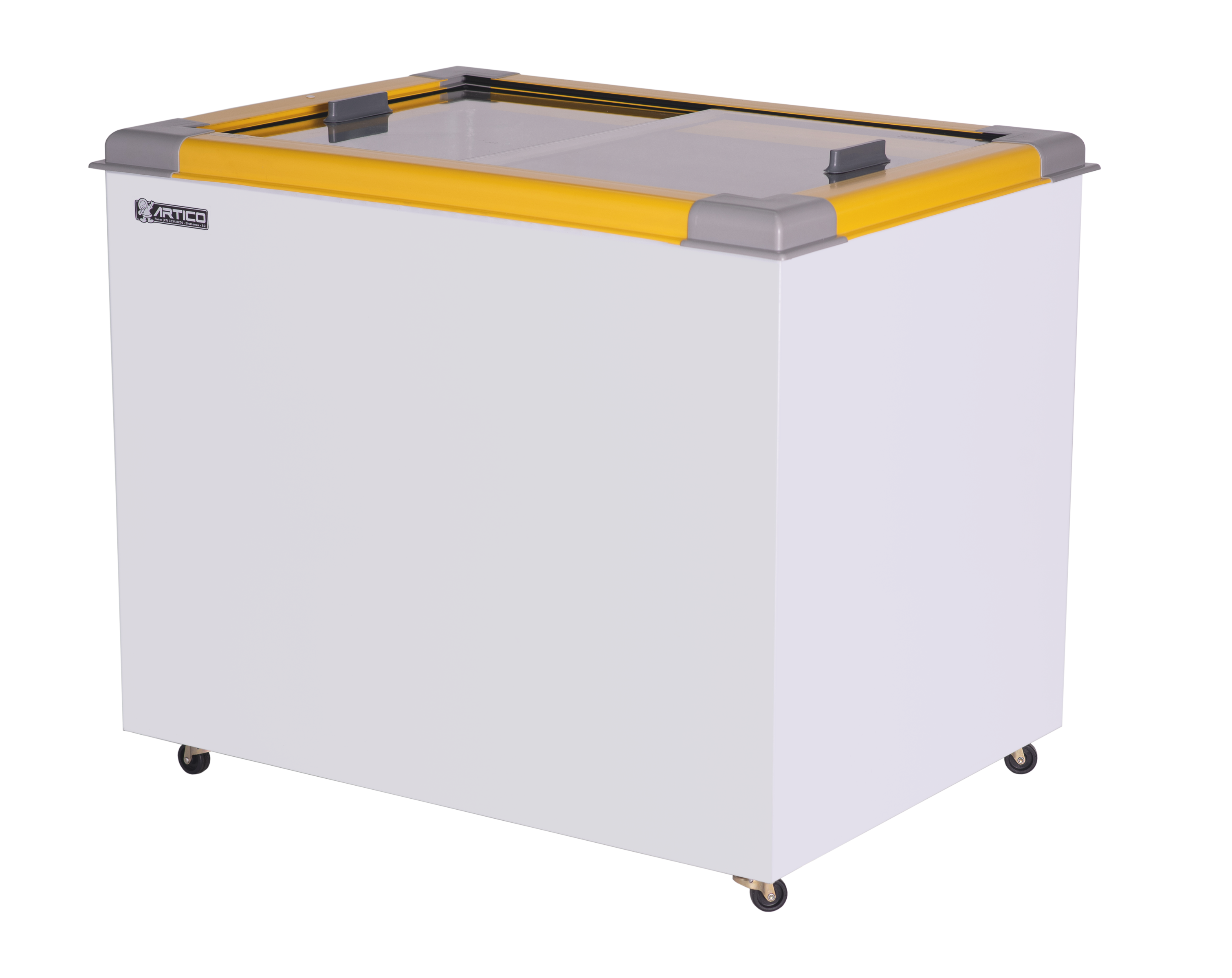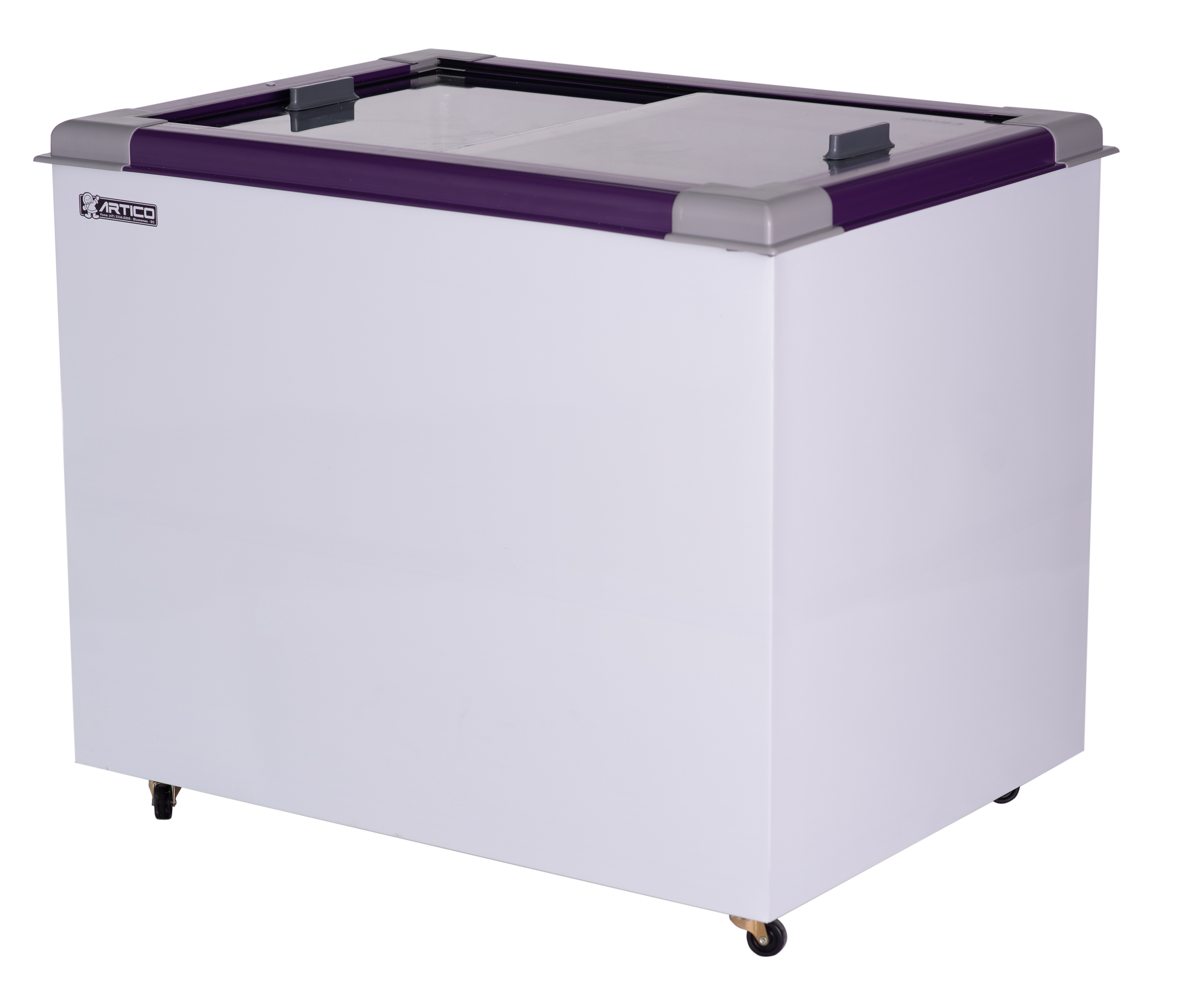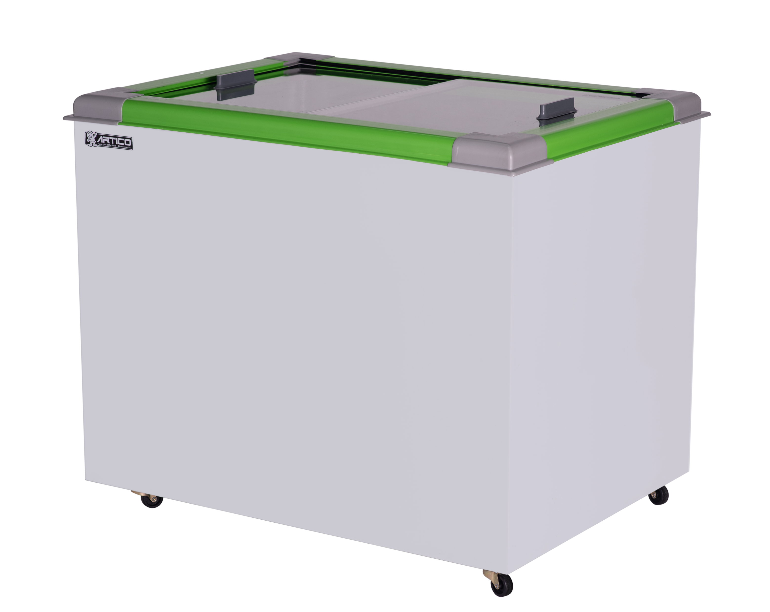 O Congelador expositor Eco 250 é plano. Possui tampas de vidro deslizante e de baixa emissividade.
